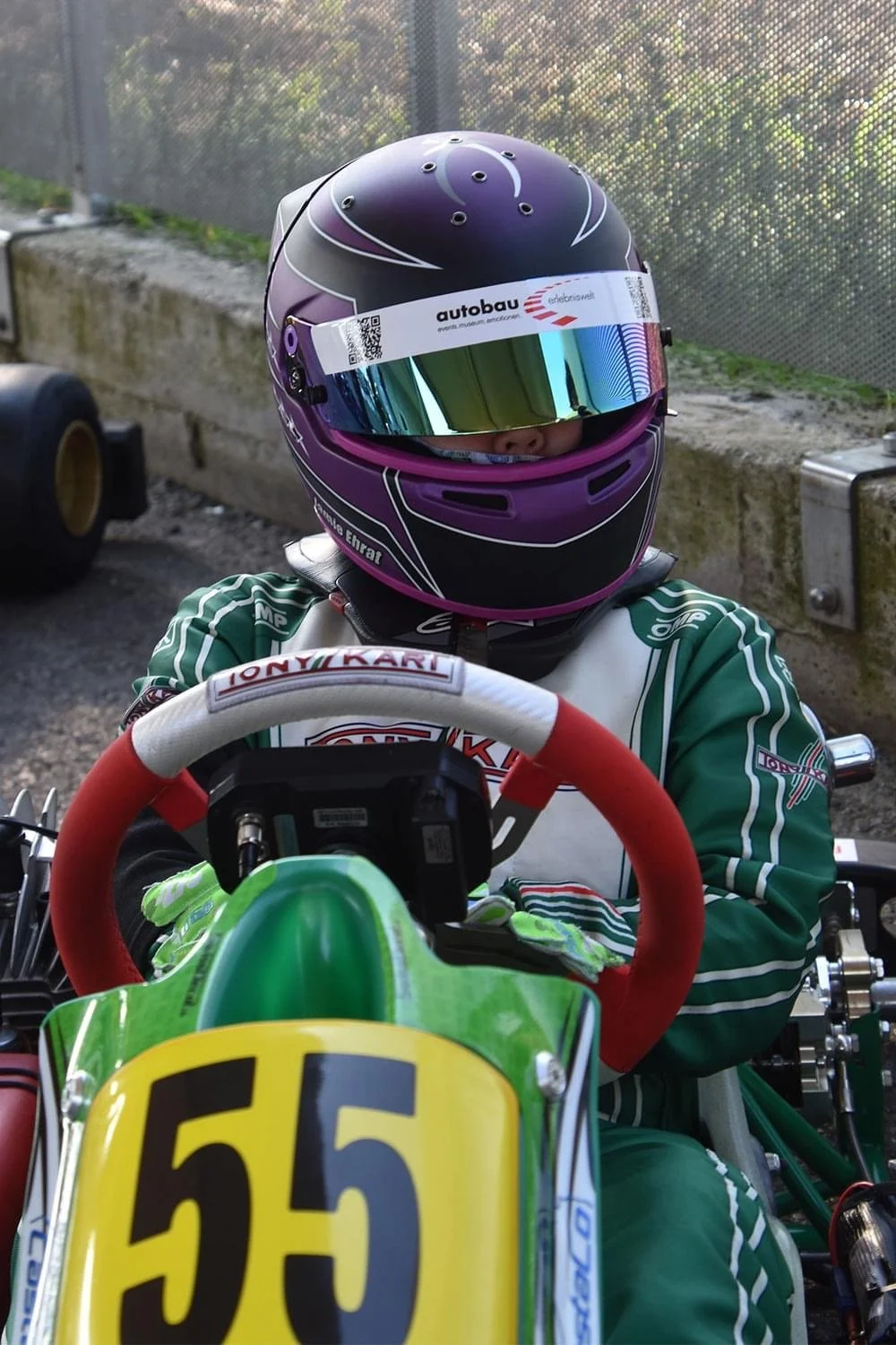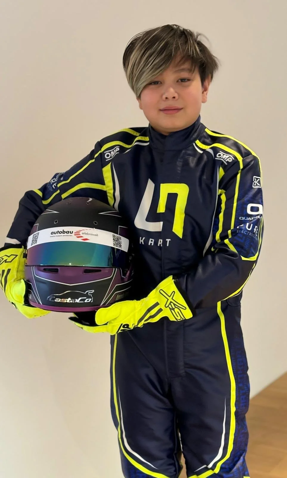 This racing suit is from the OMP brand and features a design by Tony Kart.