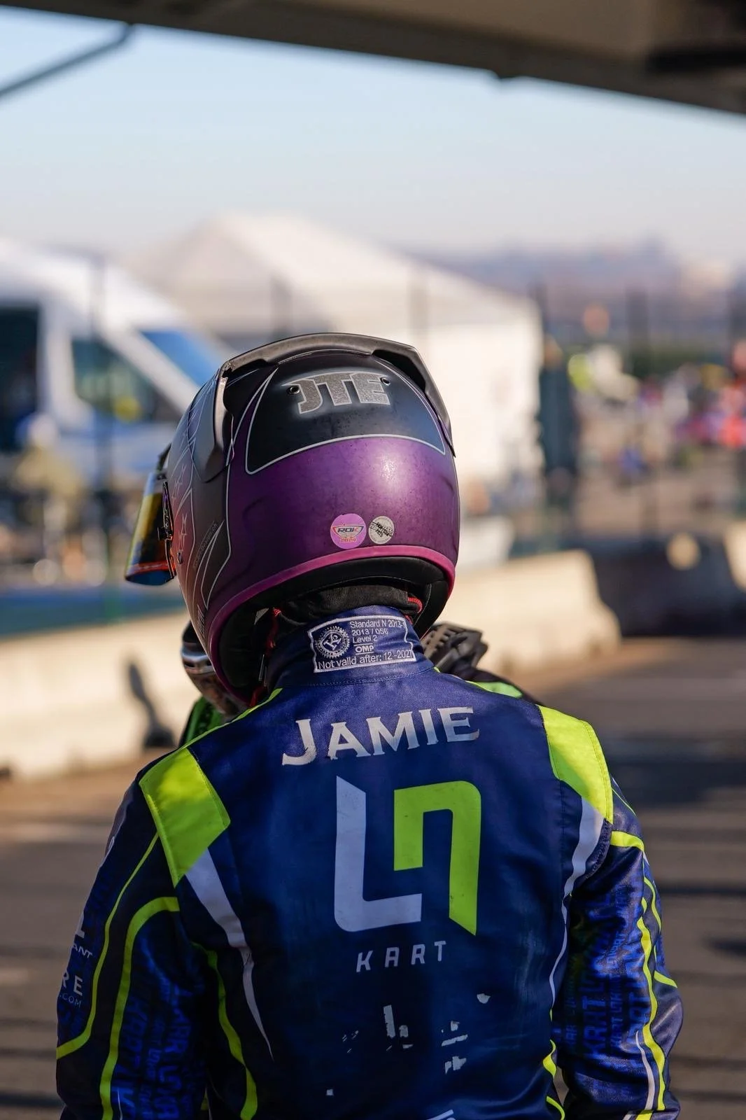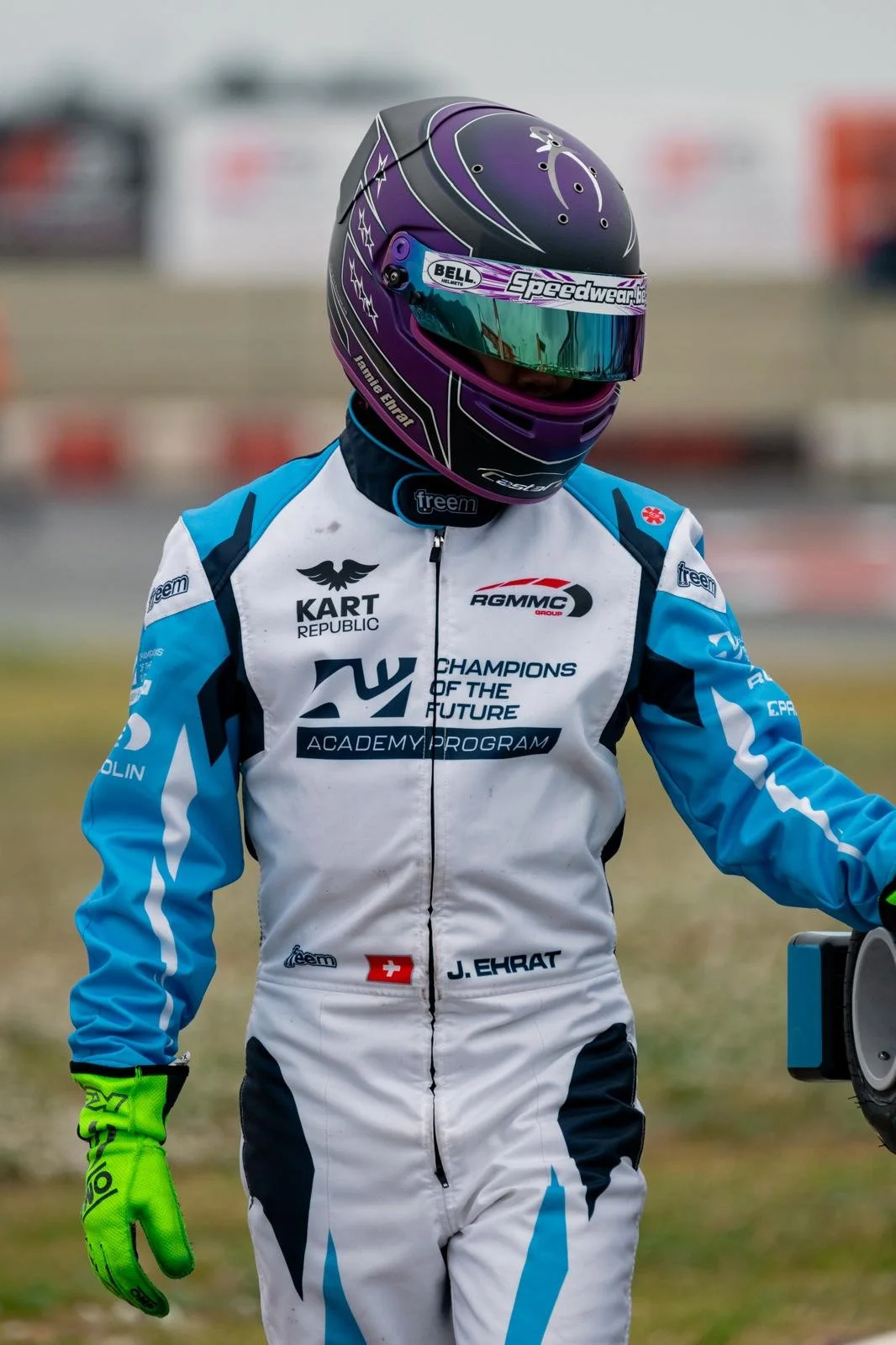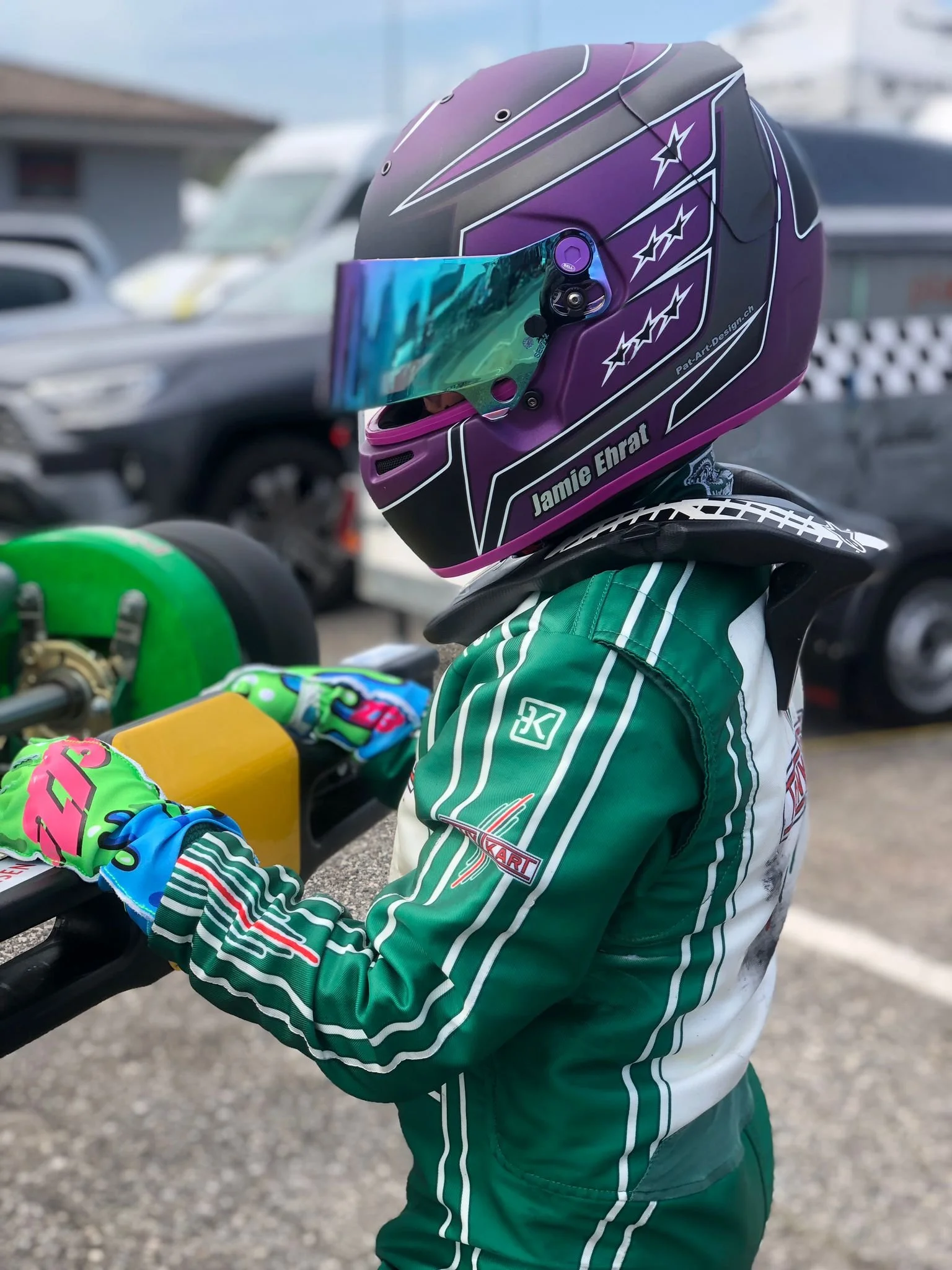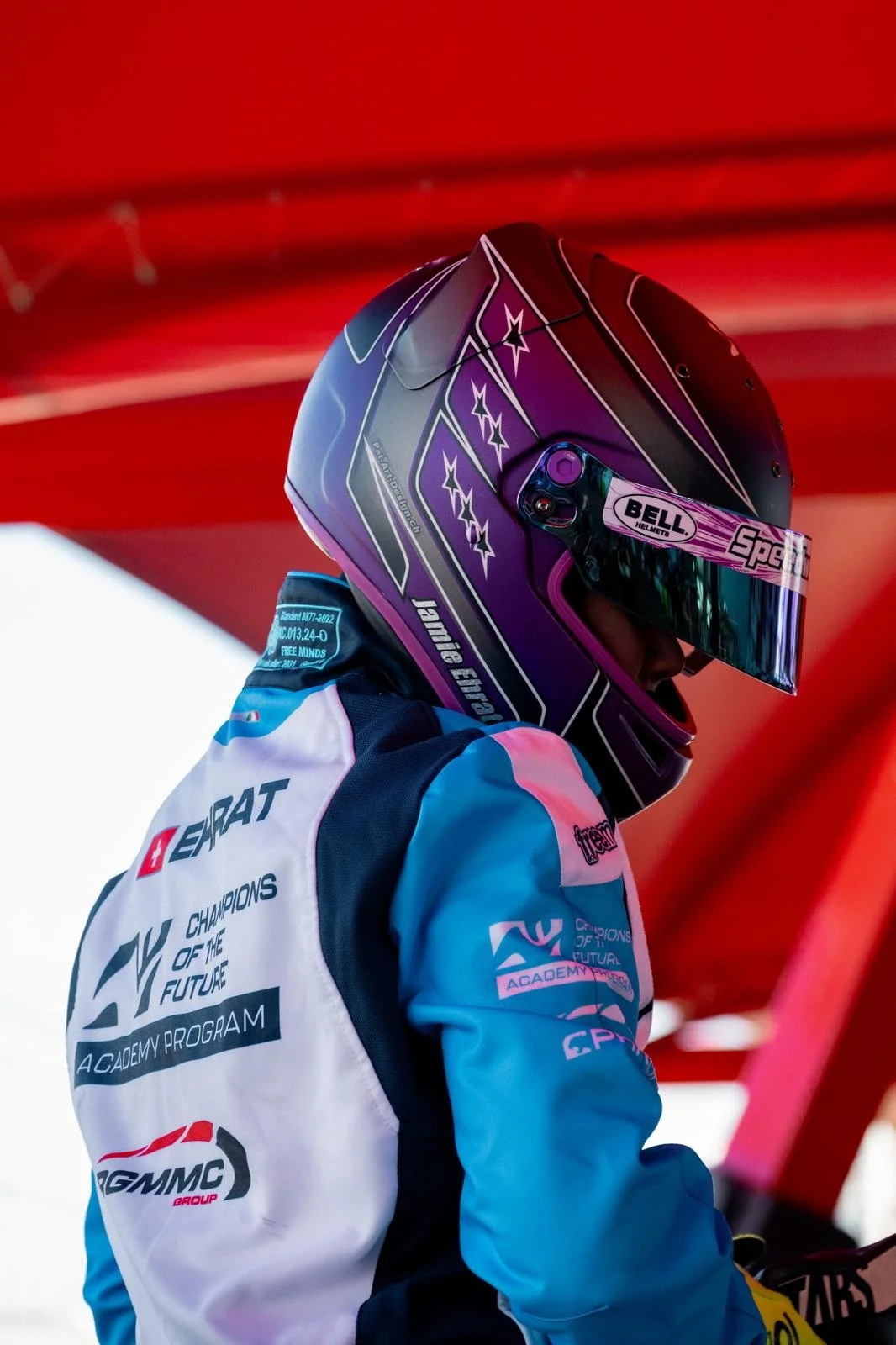 Until now, my Bell KC7 helmet was white. Thanks to the helmet sponsorship from Planeo Switzerland, we were able to create a custom helmet design. The design is based on Lewis Hamilton's helmet design, with my signature. You can make out the E (Ehrat) in the stars area and the J (Jamie) in the gray part. Working closely with Pat Art Design, was very exciting. I’m very pleased to present and wear my new helmet.