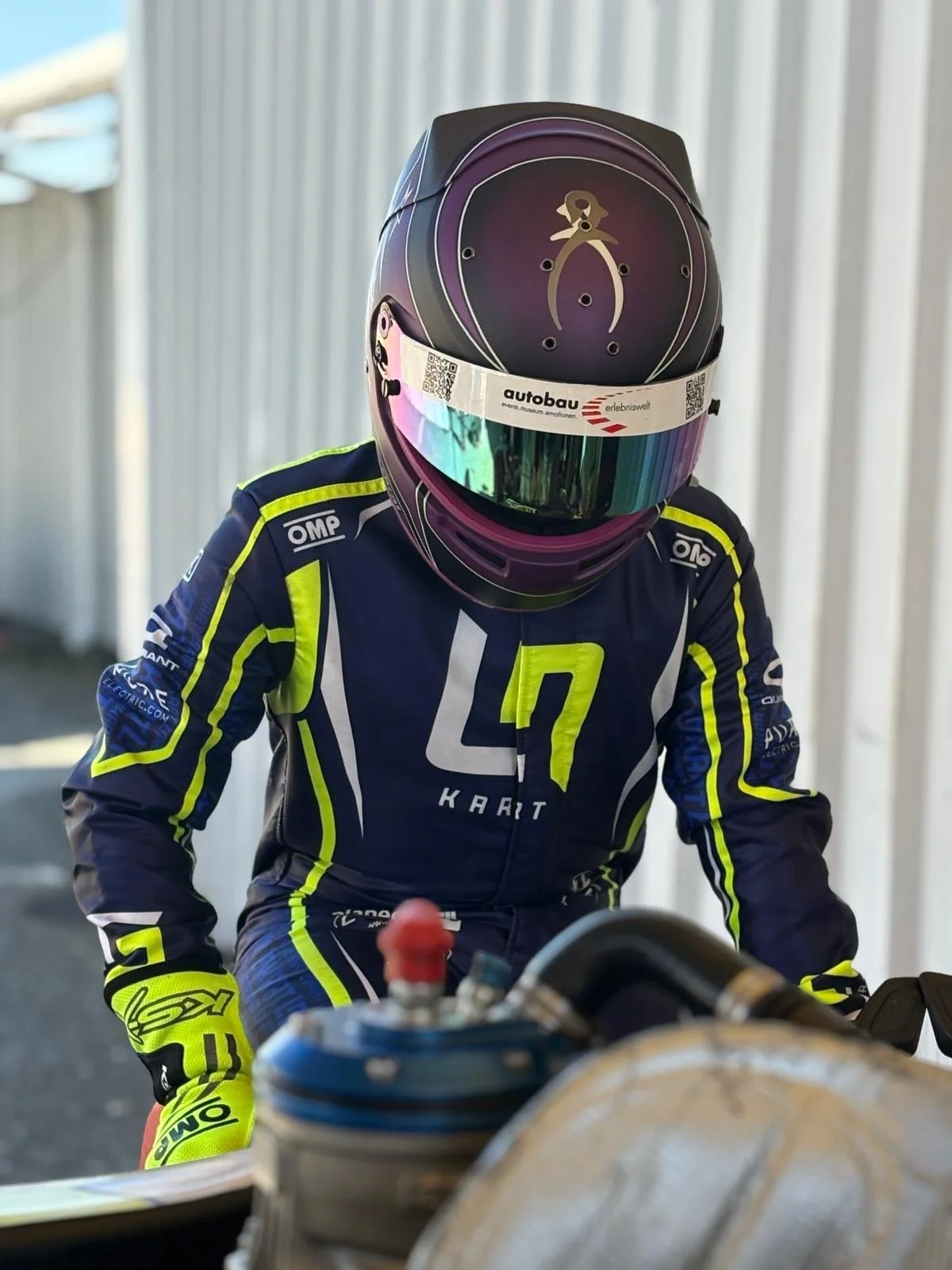 This racing suit is from the OMP brand and features a design by LN Kart (Lando Norris).